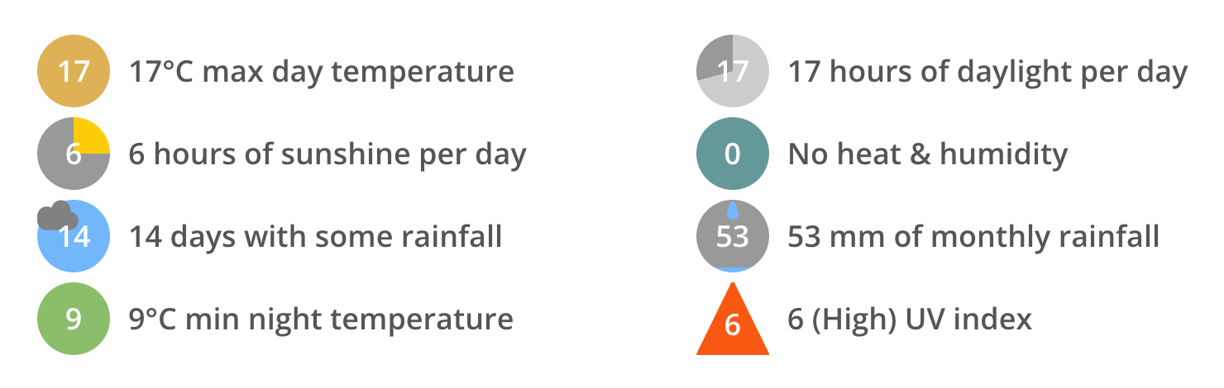 Although we have a forecast for June's weather, be aware that the weather can sometimes change frequently and it is not unusual to experience sun, clouds, rain and wind on the same day. It can also be normal for the temperature to drop down to single figure celsius at night.