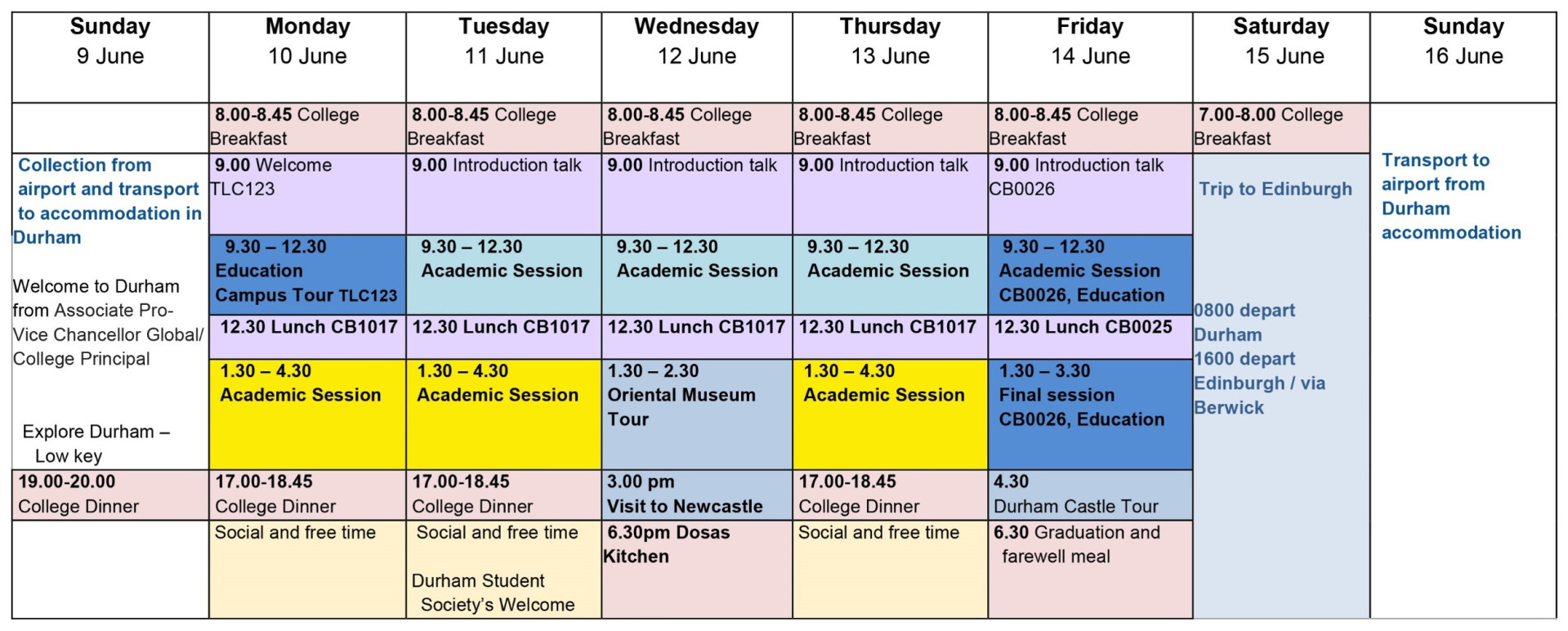 Please note that the evening meal on Saturday 15 June will be a fast food meal (to be decided) and breakfast on Sunday 16 June will be supplied to take away and consume before you get on your flight home.